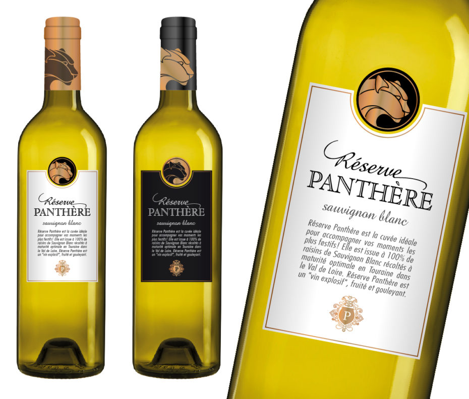 Conception d’une étiquette de vin blanc pour le marché australien. Ce sauvignon blanc sera commercialisé sous la marque Réserve Panthère. Création graphique de l’étiquette et de la capsule avec une tête de félin.